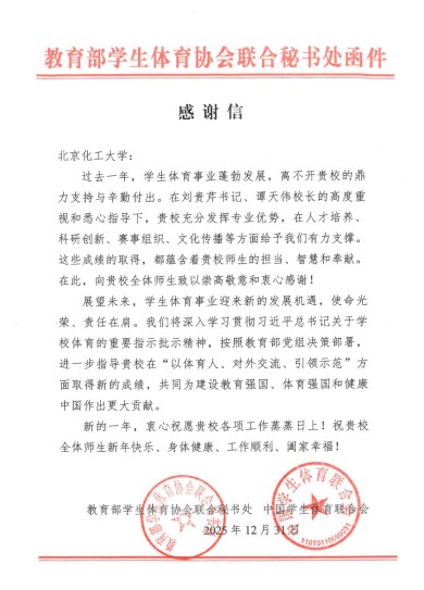 五年耕耘结硕果,砥砺奋进再出发。感谢教育部学生体育协会联合秘书处对北京化工大学体育工作的肯定与期许,未来,学校将继续深化体育教育改革,立足“以体育人”的育人理念,在人才培养、赛事组织、对外交流等方面持续发力,丰富体育文化内涵,推动体育工作与人才培养深度融合,为培养全面发展的高素质人才筑牢健康根基,共同为建设教育强国、体育强国贡献新的力量。